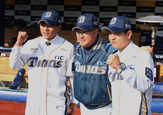 FA(자유계약선수)로 NC 유니폼을 입게 된 이종욱(왼쪽)과 손시헌(오른쪽)이 옛 스승인 NC 김경문 감독과 재회한 뒤 파이팅을 외치고 있다. 사진제공=NC다이노스