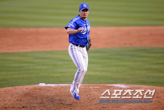 27일 오후 서울 잠실야구장에서 2013 프로야구 한국시리즈 3차전 삼성과 두산의 경기가 열렸다. 9회말 2사서 삼성 오승환이 두산 양의지를 삼진 아웃 처리한 후 펄쩍 뛰고 있다. 잠실= 김경민 기자 kyungmin@sportschosun.com / 2013.10.27. |
