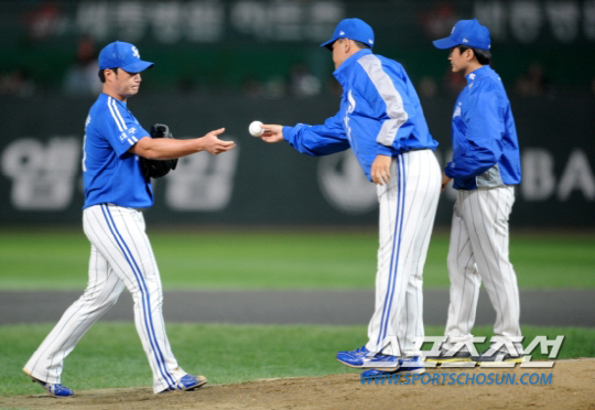 | 지난 2011년 삼성 오치아이 투수코치가 오승환에게 공을 넘기는 장면. 오치아이 전 코치는 오승환의 일본무대 성공을 확신했다. 허상욱 기자 wook@sportschosun.com |