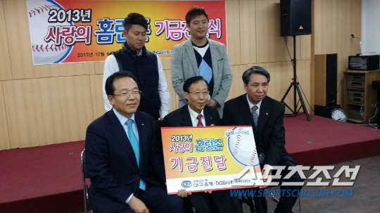 삼성이 6일 대구 남산 기독교종합사회복지관을 찾아 'DGB(대구은행) 홈런존 성금 전달 행사'를 실시했다. 이날 행사에는 이번 한국시리즈 MVP에 오른 박한이와 우동균이 참석해 올시즌 홈런존 행사를 통해 적립된 350만원을 복지관에 전달했다. 성금을 전달한 뒤 복지관 관계자들과 포즈를 취한 박한이(오른쪽)외 우동균.