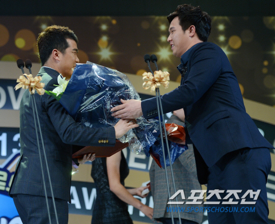 2013 프로야구 골든글러브 시상식이 10일 서울 삼성동 코엑스 오디토리움에서 열렸다. 2루수 골든글러브를 수상한 정근우가 최정의 축하 꽃다발을 받고 있다. 정재근기자 cjg@sportschosun.com