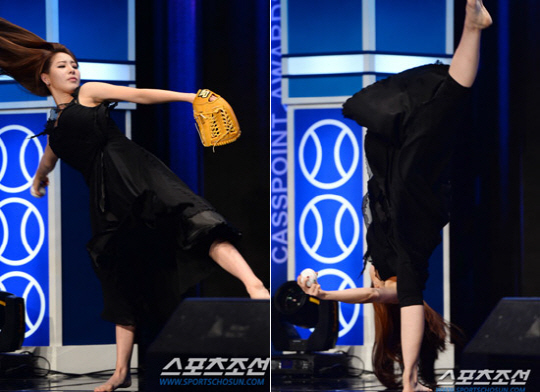 신수지는 지난 7월5일 잠실 두산-삼성전에서 오른발로 지탱한 채 상체를 360도 회전시키는 동작으로 시구를 해 큰 인기를 얻었다.