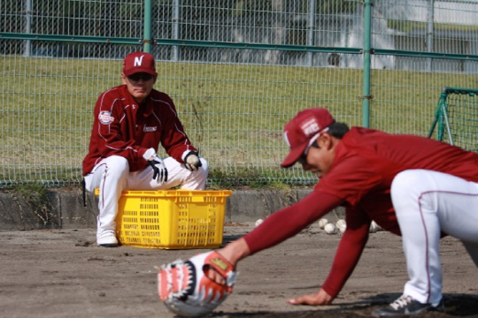 | 가고시마 마무리 캠프에서 1루수 안태영의 수비훈련을 이강철 수석코치가 지켜보고 있다. 사진제공=넥센 히어로즈 |