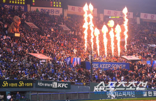 | 두산 베어스와 삼성 라이온즈의 2013 프로야구 한국시리즈 4차전 경기가 28일 잠실야구장에서 열렸다. 관중석을 가득메운 삼성팬들이 열띤 응원전을 펼치고 있다. 잠실=최문영 기자 deer@sportschosun.com |
