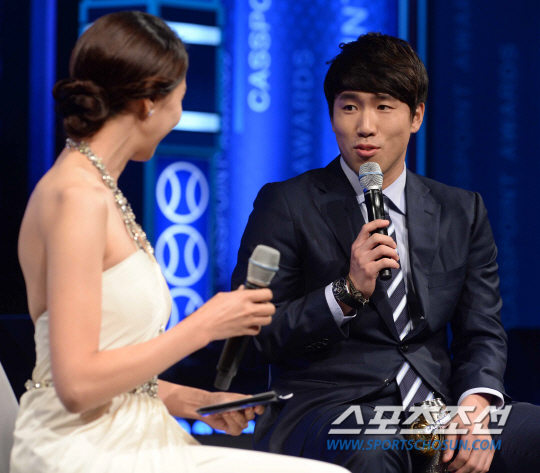 2013 카스포인트 어워즈가 9일 서울 신라호텔에서 열렸다. 카스모멘트 베스트5에 선정된 롯데 전준우가 질문에 답하고 있다. 카스포인트 어워즈는 경기 결과에 따라 선수들에게 포인트를 부여하여 누적 점수에 따라 순위를 결정하는 카스포인트 부문과 경기 중 기록으로 평가할 수 없는 결정적인 순간, 감동적인 순간을 시상하는 카스모멘트 부분으로 나누어 시상한다. 허상욱 기자 wook@sportschosun.com/2013.12.09/