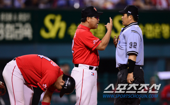 삼성과 치열한 선두 다툼을 벌이고 있는 LG와 포스트시즌 진출의 희망을 갖고 있는 SK가 3일 잠실에서 만났다. SK 최정이 7회 타석에서 LG 선발 리즈의 투구에 맞자 이만수 감독이 달려나와 박근영 주심에게 항의를 하고 있다. 최정은 1회에도 몸에 맞는 볼로 진루 했다. 잠실=조병관기자 rainmaker@sportschosun.com/2013.09.03/