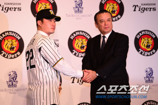 오승환의 한신타이거즈 입단 계약 조인식이 4일 리츠칼튼 호텔에서 열렸다. 이자리에는 한신 타이거즈 나카무라 가즈히로 단장과 구단 관계자, 또 많은 일본 취재진이 참석 오승환에 대한 일본내 관심을 보여 줬다. 오승환은 "한국 최고의 마무리라는 분에 넘치는 평을 받아왔는데 이제 새로운 무대에서 새로운 도전을 시작하려 한다"며 "한국 뿐 아니라 일본에서도 최고의 마무리 투수가 될 수 있도록 노력하겠다"는 입단 취지 및 각오를 밝혔다. 사진은 입단 조인식을 마친 오승환이 한신 유니폼을 입고 나카무라 단장과 포즈를 취하는 모습. 조병관기자 rainmaker@sportschosun.com/2013.12.04/