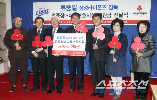 삼성 류중일 감독(가운데)이 30일 오전 11시 대구광역시 중구 삼덕동 대구사회복지공동모금회에서 기부금 2억원 전달식을 가졌다. 류 감독은 지난 9일 삼성과 계약기간 3년에 계약금 6억원, 연봉 5억원 등 총액 21억원에 재계약을 했다. 류 감독은 계약금의 3분의 1인 2억원을 기부할 뜻을 전했고, 대구의 중긍장애아동보호시설 5곳에 기부하기로 결정했다.