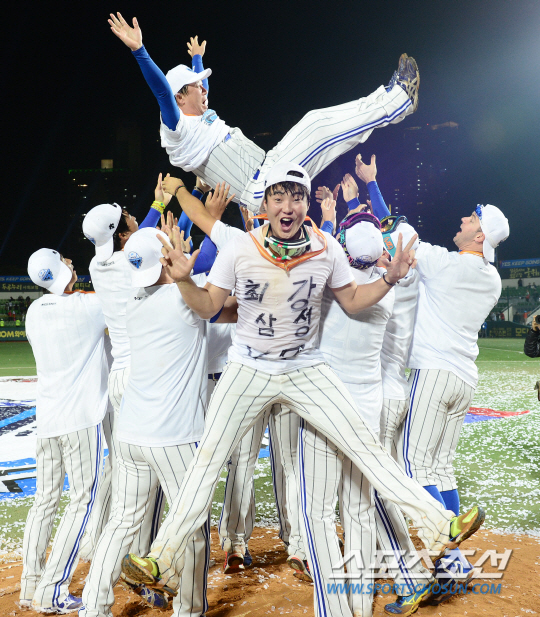삼성 라이온즈가 2013 한국시리즈 우승을 차지했다. 1일 대구구장에서 열린 한국시리즈 7치전에서 삼성은 두산을 7-3으로 꺾고 프로야구 사상 최초로 한국시리즈 3연패를 달성했다. 안지만을 비롯한 삼성 투수들이 김태한 투수코치를 헹가래치며 기쁨을 만끽하고 있다. 대구=정재근기자 cjg@sportschosun.com/2013.11.01/