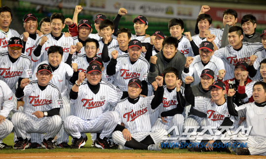 LG가 서울라이벌 두산과의 시즌 마지막 경기에서 승리를 거두며 플레이오프 직행을 확정지었다. LG가 5일 잠실구장에서 열린 두산과의 경기에서 5대2로 승리를 거두며 한화에 패한 넥센을 제치고 2위로 올라서게 됐다. 경기 종료 후 진행된 LG 최동수의 은퇴식에서 최동수가 김기태 감독 및 선수들과 기념촬영을 하고 있다. 잠실=허상욱 기자 wook@sportschosun.com/2013.10.05/