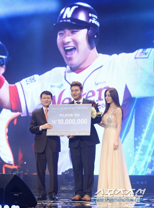 넥센 박병호가 9일 신라호텔 다이너스티 홀에서 열린 '2013 카스포인트 어워즈' 시상식에서 대상을 수상하고 있다. '카스포인트 어워즈'는 한해동안 프로야구에서 활약한 선수돌과 관계자들들을 대상으로 카스포인트 누적 점수에따라 순위를 결정하는 카스포인트 부문과 역동적인 영상이나 팀승리에 영향을 미친 장면을 선정해 시청자 투표를 통해 결정하는 카스모멘트 부문으로 이루어 졌다. 신라호텔=최문영 기자 deer@sportschosun.com /2013.12.09/