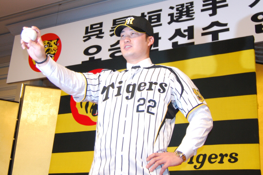 일본 산케이신문이 2014시즌 일본 프로야구를 예상했는데 요미우리 자이언츠와 소프트뱅크 호크스를 각각 우승 후보로 꼽았다. 산케이신문 오사카지국 스포츠부 프로야구 담당 기자 4명은 만장일치로 센트럴리그에선 요미우리, 퍼시픽리그에서 소프트뱅크가 우승할 것으로 전망했다. 가장 안전한 선택을 한 것이다. 오승환의 한신 타이거즈 일본 입단식 모습. 사진제공=무로이 마사야 |