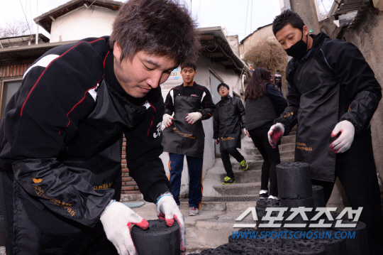3일 오후 서울 성북구에서 LG 트윈스가 선수와 팬이 함께하는 '사랑의 연탄배달' 행사를 개최했다. LG 선수단 및 프런트, 팬이 참가하여 소외계층을 돕는 사회공헌 활동으로 지난 2011년부터 매년 진행되고 있다. LG는 연탄 5000장을 따뜻한 한반도 사랑의 연탄나눔운동 단체에 기부한다. '사랑의 연탄배달' 행사에서 LG 이진영(왼쪽)과 이병규가 연탄을 나르고 있다. 김경민 기자 kyungmin@sportschosun.com