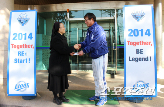 삼성 류중일 감독이 13일 경산볼파크에서 충주 성심학교 야구부 문선희 교장 수녀에 1000만원을 전달했다. 류 감독은 3년째 충주 성심학교 야구부에 매년 1000만원씩을 지원하고 있다.