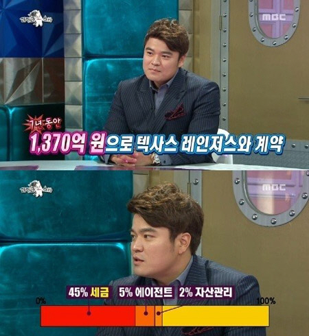 이에 추신수는 "(미국에서) 세금을 45% 뗀다. 5%는 에이전트비, 2%는 자산관리사에게 지급한다"라며 "실제로 내가 갖는 금액은 40~45% 정도다"라고 1370억원 중 자신의 몫에 대해 밝혔다.