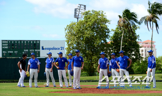 삼성라이온즈 선수단이 괌에 위치한 레오팔레스 리조트에서 1차 전지훈련을 시작했다. 삼성의 괌 1차 전지훈련 캠프는 2월 7일까지 실시한다. 투수조가 수비 훈련을 하고 있다. 괌=송정헌 기자 songs@sportschosun.com/2014.01.19