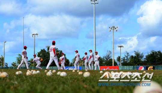 KIA의 투-포수조가 괌 파세오 구장에서 전지훈련을 진행했다. KIA 괌 캠프조는 선동열 감독을 비롯한 코칭스태프 5명과 서재응 등 투수 20명, 김상훈 등 포수 4명, 브렛필(내야수) 등 총 29명으로 구성돼 있다. 올 시즌 대반격을 준비하는 KIA가 해외 전지훈련을 시작으로 2014시즌을 향한 본격적인 담금질에 들어갔다. KIA 선수들이 수비 훈련을 하고 있다. 괌=송정헌 기자 songs@sportschosun.com/2014.01.18