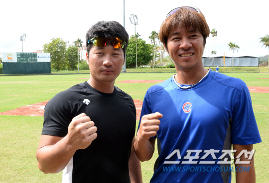 삼성라이온즈 선수단이 괌에서 전지훈련을 시작했다. 삼성은 괌에 위치한 레오팔레스 리조트에서 1월 15일부터 2월8일까지 1차 전지훈련을 진행한다. 삼성과 함께 훈련에 임하는 오승환, 임창용이 포즈를 취하고 있다. 괌=송정헌 기자 songs@sportschosun.com/2014.01.17