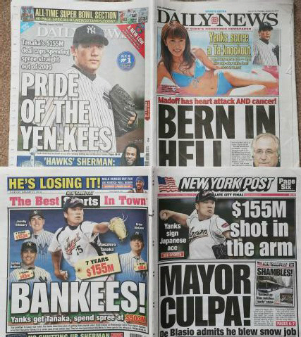 | 다나카의 양키스행을 대서특필한 데일리 뉴스(위)와 뉴욕 포스트(아래). 사진캡처=스포츠닛폰 인터넷판 |