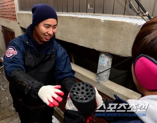 16일 서울 송파구 거여동에서 프로야구 두산베어스가 '사랑의 연탄나르기' 행사를 펼쳤다. 이 날 두산베어스는 선수들과 임직원이 참석한 가운데 서울시 사회복지회와 함께 소외된 이웃을 찾아 연탄 5,000장을 전달했다. 두산베어스는 올해 '베어스 송년의 날'을 뜻 깊은 봉사 활동으로 대신 했다. 유희관(왼쪽)이 정수빈과 밝은 표정으로 연탄을 나르고 있다. 거여동=송정헌 기자 songs@sportschosun.com/2013.12.16 |