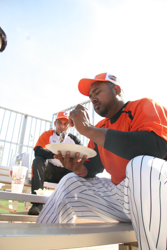 구단이 준비한 햄버거 대신 한국의 매운 맛을 경험해보겠다며 선수단 점심메뉴였던 김치볶음밥을 먹고 있는 루이스 히메네스. 사진제공=롯데자이언츠