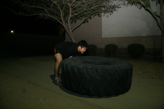 하나는 무거운 해머로 내리치는 데, 다른 하나는 들어서 뒤집기를 반복하는 데 사용한다. 무거운 해머를 드는 것도 힘든데 그걸 내리쳐야 하니 힘과 집중력이 동시에 필요하다. 타이어를 뒤집는 것도 온 몸을 움크렸다가 일어서면서 뒤집는게 쉽지 않다.