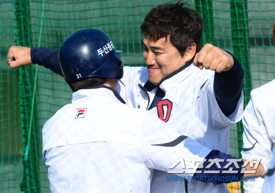 | 정수빈이 두 팔 크게 벌린 홍성흔의 품에 와락 안겼다. 왜일까? 미야자키(일본)=정재근기자 |