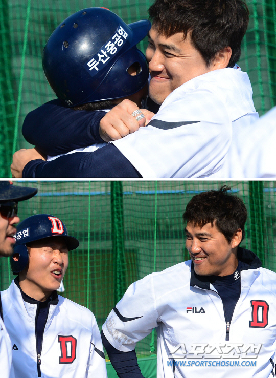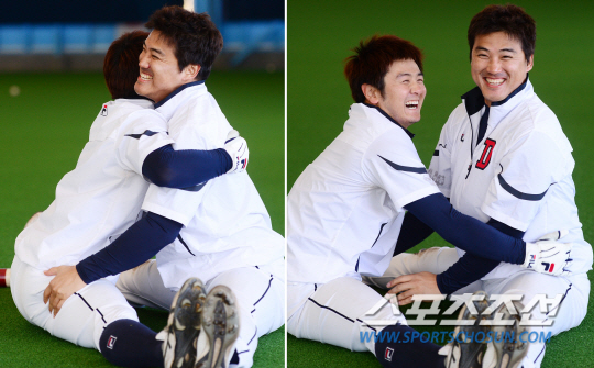 | "현수야 내 맘 알지?" 스스럼 없이 손깍지를 끼는 홍성흔 때문에 김현수가 웃음을 터트렸다. |
