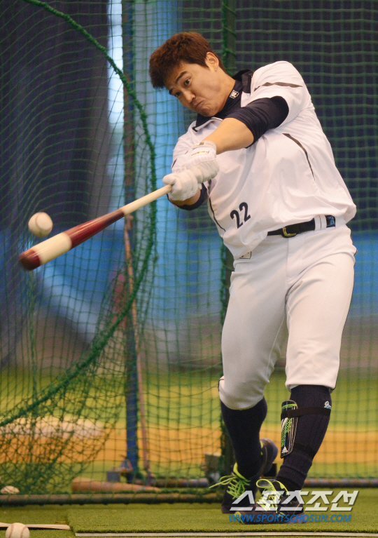 7일 오후 두산 베어스 선수들이 스프링캠프가 차려진 일본 미야자키 기요다케 운동공원에서 훈련을 했다. 홍성흔이 피칭머신에서 날아온 공을 힘차게 때리고 있다. 이날 훈련은 비가 내리는 날씨로 인해 투포수조와 야수조가 오전과 오후로 나눠 실내훈련장에서 훈련을 했다. 미야자키(일본)=정재근기자 cjg@sportschosun.com/2014.02.07/