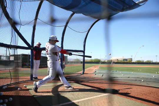 | 박병호가 미국 애리조나 스프링캠프에서 수비 모자를 쓰고 타격훈련을 하고 있다. 박병호는 지난달 15일 캠프지로 이동하는 과정에서 헬멧이 든 짐을 분실했다. 아직까지 찾지 못해 수비 모자를 쓰고 타격훈련을 하고 있다. 사진제공=넥센 히어로즈 |