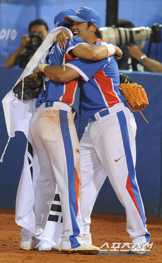 | 19일 아오티 스포츠센터 베이스볼필드에서 열린 2010 광저우아시안게임 야구 결승 경기에서 한국 대표팀이 대만을 누르고 금메달을 땄다. 경기를 마친 추신수가 강정호와 포옹을 하며 좋아하고 있다.(광저우(중국)=조병관 기자 rainmaker@sportschosun.com) |
