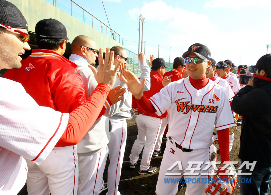 | SK가 21일 삼성과의 연습경기에서 스캇과 조인성의 홈런포를 앞세워 10대2로 승리했다. 사진제공=SK 와이번스 |
