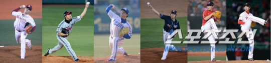오승환이 떠난 한국프로야구에 누가 최고 마무리가 될까. 왼쪽부터 넥센 손승락, LG 봉중근, 삼성 안지만, 두산 이용찬, SK 박희수, 김광현. 스포츠조선DB