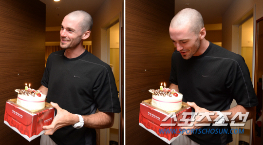 오키나와 스프링캠프 도중 생일을 맞은 한화 클레이를 위해 동료 투수들이 깜짝 이벤트를 열었다. 고개를 숙여 "감사합니다"라고 말하는 클레이. 오키나와(일본)=허상욱 기자 wook@sportschosun.com/2014.02.17/ |