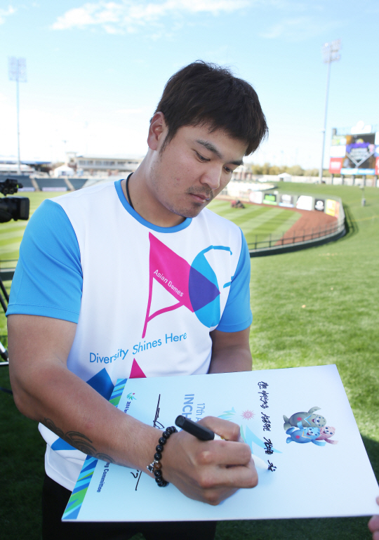 | 2014년 인천아시안게임 홍보대사에 위촉된 추신수가 미국 애리조나 서프라이즈에 위치한 텍사스 레인저스 스프링캠프에서 대회 성공을 기원하며 사인을 하고 있다. 사진제공=인천아시안게임 조직위원회 |