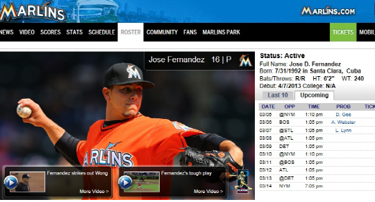 쿠바 특급 페르난데스는 일찌감치 이번 2014시즌 개막전 선발 투수로 낙점됐다. 그는 다음달 1일 홈에서 벌어지는 콜로라도 로키스와의 홈 개막전에서 선발 등판한다. 그렇게 되면 마이애미 역사상 최연소 개막전 등판 기록을 세우게 된다. 종전 기록은 2003년 조시 베켓(현 LA 다저스)이 세운 22세였다.