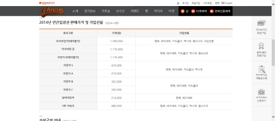 롯데 자이언츠가 발표한 2014시즌 연간 입장권 가격. 사진캡처=롯데 자이언츠 홈페이지