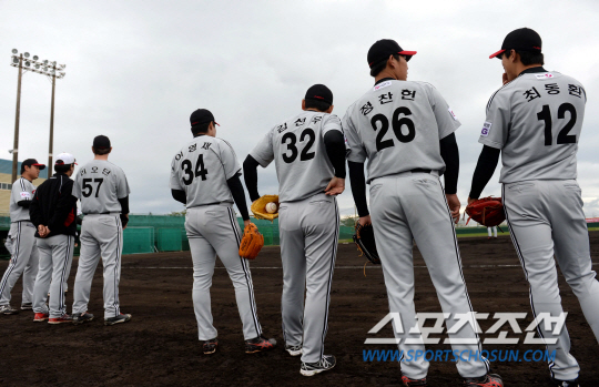 LG 트윈스 선수단이 일본 오키나와 이시카와 구장에서 전지훈련을 펼치고 있다. 19일 진행된 훈련에서 선수들이 자신의 차례를 기다리며 훈련을 지켜보고 있다. 오키나와(일본)=허상욱 기자 wook@sportschosun.com/2014.02.19/