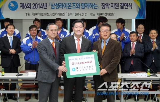 삼성 김 인 사장등 임직원과 류중일 감독을 비롯한 선수단이 7일 대구지방검찰청 대회의실에서 강력범죄 피해가구 자녀 장학지원 결연식을 가졌다. 삼성은 자매결연을 맺은 20명에게 매달 10만원씩 자비로 지원하게 된다. 사진제공=삼성 라이온즈