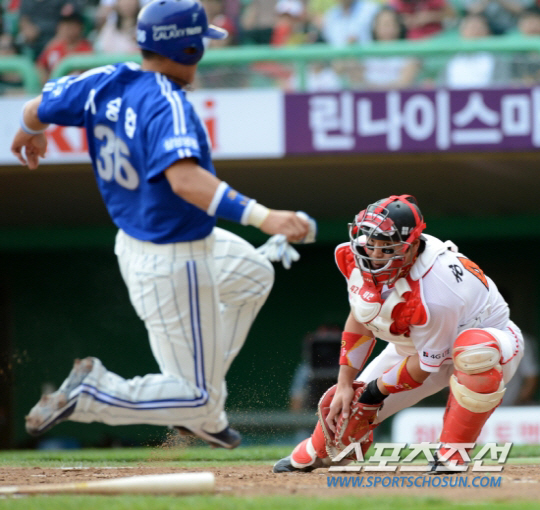 SK와 삼성의 주말 3연전 마지막날 경기가 10일 인천 문학구장에서 열렸다. 4회초 1사 만루 삼성 손주인의 중견수 희생플라이때 3루주자 이승엽이 홈으로 파고들어 세이프되고 있다. SK 포수는 정상호. 인천=허상욱 기자 wook@sportschosun.com