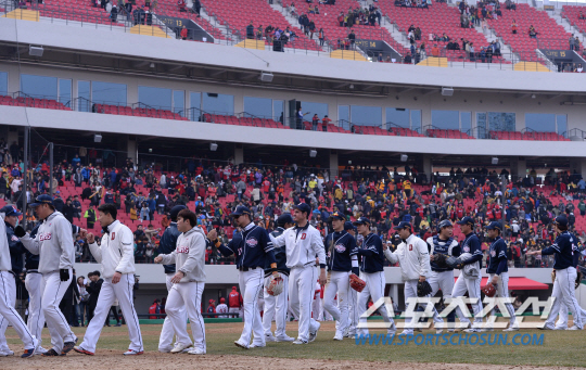 15일 오후 광주 기아 챔피언스 필드에서 2014 프로야구 시범경기 두산과 KIA의 경기가 열렸다. 6대4로 승리한 두산 선수들이 하이파이브를 나누고 있다. 광주=김경민 기자 kyungmin@sportschosun.com / 2014.03.15.