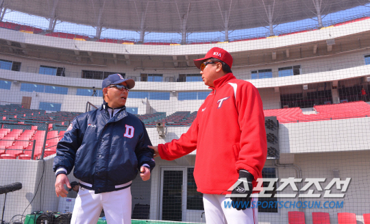 15일 오후 광주 기아 챔피언스 필드에서 2014 프로야구 시범경기 두산과 KIA의 경기가 열렸다. 경기 전 두산 송일수 감독(왼쪽)과 KIA 선동열 감독이 반갑게 인사를 나누고 있다. 광주=김경민 기자 kyungmin@sportschosun.com
