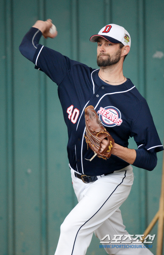 2월7일 오후 두산 베어스 선수들이 스프링캠프가 차려진 일본 미야자키 기요다케 운동공원에서 훈련을 했다. 니퍼트가 불펜피칭에서 힘차게 공을 던지고 있다. 이날 훈련은 비가 내리는 날씨로 인해 투포수조와 야수조가 오전과 오후로 나눠 실내훈련장에서 훈련을 했다. 미야자키(일본)=정재근기자 cjg@sportschosun.com/2014.02.07/