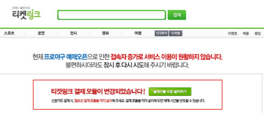 현재 티켓링크 홈페이지에는 "현재 프로야구 예매오픈으로 접속자 증가로 서비스 이용이 원활하지 않습니다. 불편하시더라도 잠시 후 다시 시도해 주시기 바랍니다"고 공지를 게재했다.