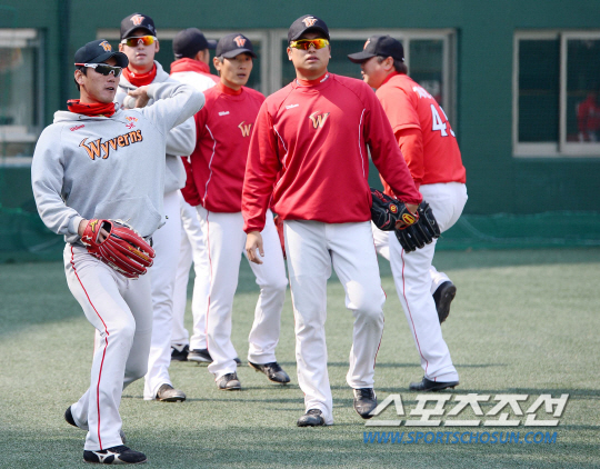 2014 프로야구 넥센 히어로즈와 SK와이번즈의 시범경기가 14일 목동야구장에서 열렸다. 경기전 SK 김광현이 동료투수들과 수비훈련에 열중하고 있다. 목동=최문영 기자 deer@sportschosun.com /2014.03.14/ |