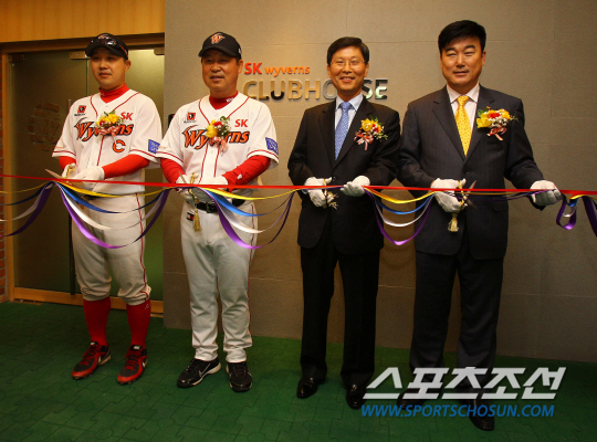 20일 2014 프로야구 시범경기 SK와 LG의 경기가 펼쳐질 인천 문학구장에서 새롭게 단장한 SK 와이번스의 클럽하우스가 공개됐다. 주장 박진만, 이만수 감독, 임원일 사장, 민경삼 단장이 테이프 커팅식을 진행하고 있다. 인천=허상욱 기자 wook@sportschosun.com/2014.03.20/