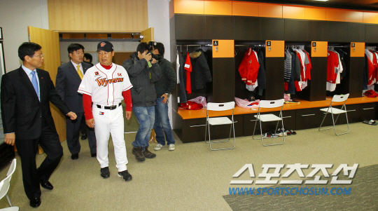 20일 2014 프로야구 시범경기 SK와 LG의 경기가 펼쳐질 인천 문학구장에서 새롭게 단장한 SK 와이번스의 클럽하우스가 공개됐다. 이만수 감독, 임원일 사장, 민경삼 단장이 라커룸을 살펴보고 있다. 인천=허상욱 기자 wook@sportschosun.com/2014.03.20/