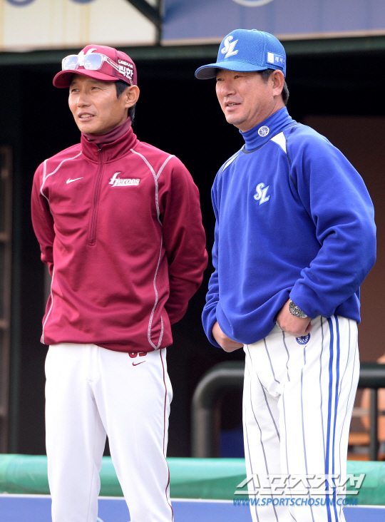 20일 목동구장에서 프로야구 시범경기 넥센과 삼성의 2연전 첫 경기가 열렸다. 경기 전 넥센 염경엽 감독과 삼성 류중일 감독이 대화를 나누고 있다. 목동=송정헌 기자 songs@sportschosun.com/2014.03.20