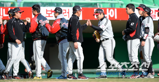 SK와 LG의 2014 프로야구 시범경기가 20일 인천 문학구장에서 열렸다. 3대3 무승부로 경기를 마친 LG 선수들이 하이파이브를 하고 있다. 인천=허상욱 기자 wook@sportschosun.com/2014.03.20/