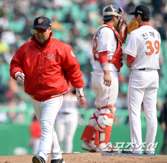 SK와 두산의 2014 프로야구 시범경기가 23일 인천 문학구장에서 열렸다. SK 이만수 감독이 5회초 2사 1,2루 두산 오재원 타석때 투수를 진해수로 교체한 후 마운드를 내려오고 있다. 인천=허상욱 기자 wook@sportschosun.com